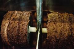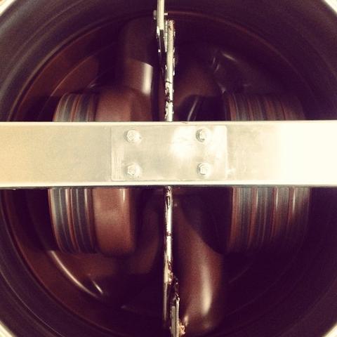 To achieve the proper texture, the nibs are poured into a rotating drum, with huge granite rollers. This machine is called a Melangeur.